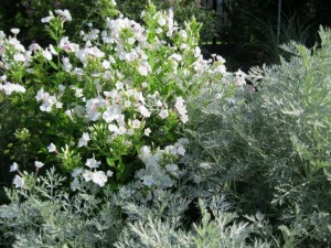 The white flowers of the phlox are complemented by the silvery tones of the artemesia in this fragrant combo that is especially pretty in moon light. The fine texture of the artemesia gives a delicate, lacy look to the combination while the frilly appearance of the phlox’ flower heads introduce a romantic note. The rounded growth habit of ‘Powis Castle’ provides a nice contrast to the upward thrust of the flower-bearing phlox stems. By including three different phlox’ the bloom period can be extended through the summer. ‘Powis Castle’ will look good all season. Plants do best in sun and well-drained soil.