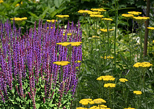 This combination of violet-purple hybrid sage paired with deep mustard-yellow yarrow make a vivid statement over a long bloom period in summer. The flowering spikes of the sage give an upright thrust in counterpoint to the flat flowerheads of the yarrow while the fern-like gray-green foliage of the yarrow produces an attractive accompaniment for the blooms. Both plants thrive in full sun with medium to dry, well-drained soil. For a similar combination of indigo blue and mustard yellow substitute the cultivar “May Night” the ‘East Friesland’ sage.