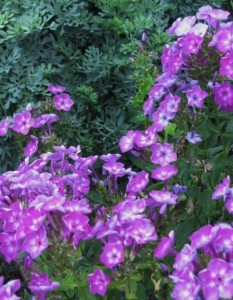 The fine delicate foliage of the rue appears in the spring adding a lovely blue green color to the garden. It is followed later in the summer by the purple-blue flowers of the garden phlox ‘Laura’ that echo the blue of the rue leaves. At summer’s end the phlox fades but the foliage of the rue remains until frost. Both plants thrive in full sun and moist but well-drained soil.
