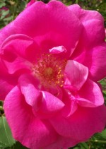 FrontenacMasses of cupped shaped light crimson or deep pink flowers are produced in clusters of three to eight. A patch of white adorns the center and forms streaks into the petals. Dense shrubby plants carry dark green glossy foliage. Outstanding resistance to black spot. Flowers are good for cutting. Comte Frontenac was a governor of New France in the late 17th century.