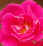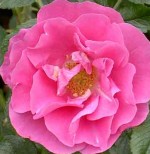Masses of cupped shaped light crimson or deep pink flowers are produced in clusters of three to eight. A patch of white adorns the center and forms streaks into the petals. Dense shrubby plants carry dark green glossy foliage. Outstanding resistance to black spot. Flowers are good for cutting. Comte Frontenac was a governor of New France in the late 17th century.