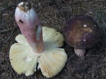 The charcoal burner can be found singly or in troops from summer to fall in deciduous and coniferous woodlands of the northern temperate zone including North America and Europe. It especially favors oak, beech and birch stands, and prefers pines to other conifers. The mushroom stands 2 to 4.75 inches tall and has a cap two to six inches across. The cap is convex to flat with an indentation in the center, smooth, slightly greasy, and varies in color from violet, to greenish or wine-red with dark patches developing over time. The whitish to cream colored gills are thick, crowded, forked at the base, greasy to the touch, and flexible. If you run your fingers over the gills they do not break as those of most other mushrooms do. The white stem is firm but brittle, ½ to 11/8 inch in diameter, and has a slightly wrinkled surface. It becomes spongy and hallow with age. The spores are white.