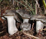The March wax cap grows singly, scattered or in clusters in the siliceous soil of mixed forests in the mountains of North America, Europe and Asia. It appears in the litter or moss under pine trees, Norway spruce, fir, and beech in spring often as the last snow melts. The mushroom is 1.5 to 3.75 inches tall with a cap 2.5 to 6 inches across. The fleshy cap is convex at first but flattens, develops a depression in the center, and becomes irregular with age. It is smooth and white before turning gray and almost black over time. The margin inrolls at first but flattens and may become uplifted and irregular. The white gills are crowded, slightly curved, slowly turn gray and become well spaced out. The stem is white tuning gray, often curved at the bottom, and less than an inch in diameter. The spores are white.