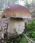 Also known as the porcino (plural, porcini) mushroom, this distinctive fungus is a favorite of cooks. It is found in late summer and fall growing in deciduous woods especially oak and chestnuts, or in coniferous forests especially pine and spruce. Although widely distributed in the Northern Hemisphere, it is not found naturally in the Southern Hemisphere. The cep is very large, standing up to twelve inches tall, and having a cap that is two to ten inches across. The cap is hemispherical, fleshy, and firm when young but flattens out with age. Its surface is beige to reddish brown, smooth or slightly rough, and sticky when wet. The long thin tubes and small pores are white at first turning yellow then olive green. The spores are olive-brown. The club-shaped to bulbous stem is massive, up to ten inches long by four inches across, white, and finely reticulated. The flesh is firm when young but becomes spongy with maturity.