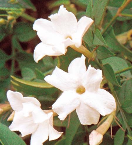 A vigorous climber, common jasmine can grow up to 30 feet long. Several attractive varieties are available including J. o. affine that has larger flowers with a pink blush, and ‘Aureum’ with gold splashed leaves, and Argenteovariegatum’ with white-marked leaves.